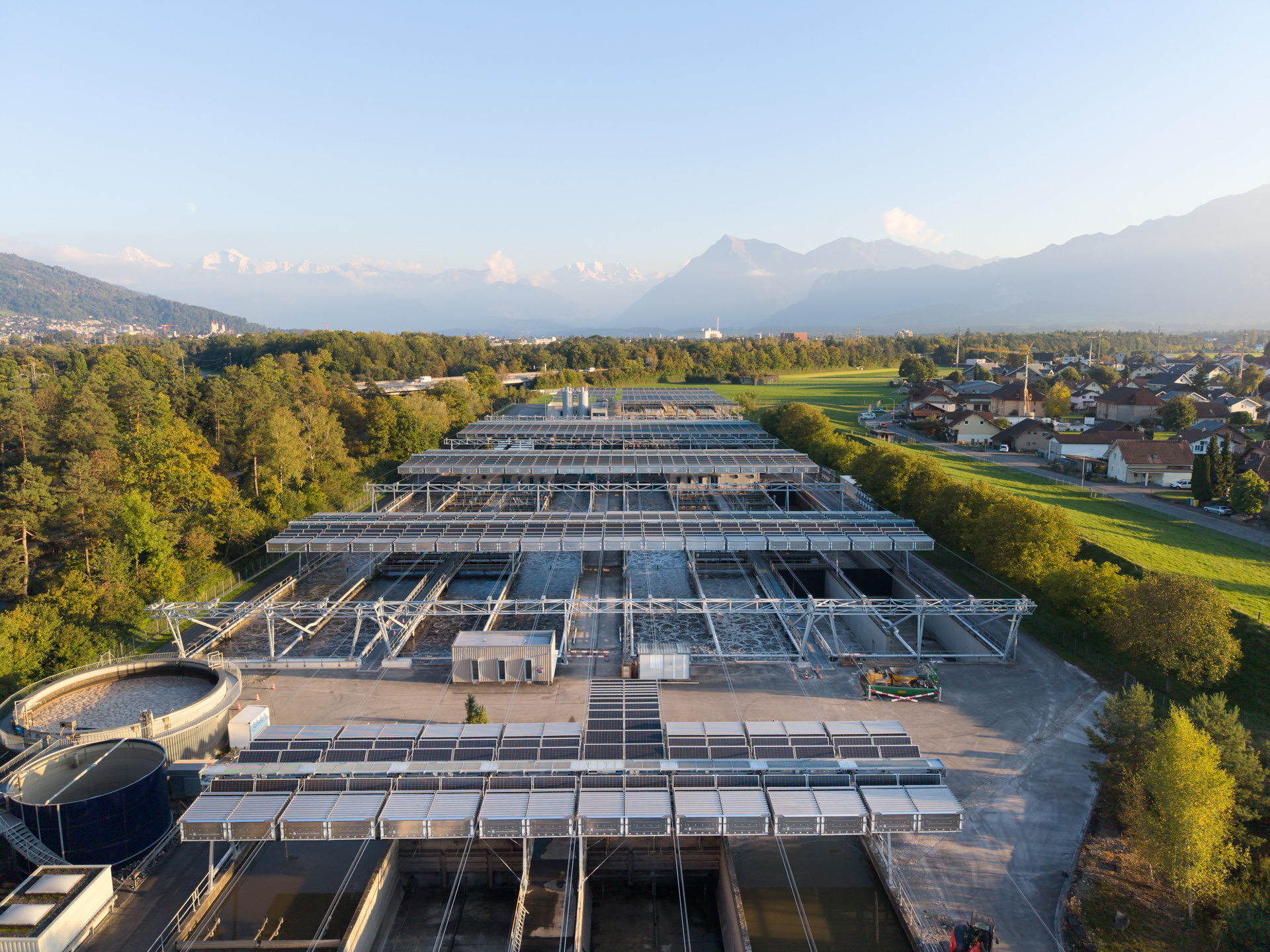 Die ARA Thunersee will die Erzeugung erneuerbarer Energien ausbauen. Deshalb wurde über den Becken der Kläranlage die aktuell weltweit grösste bewegliche Solarfaltdach-Anlage installiert.
