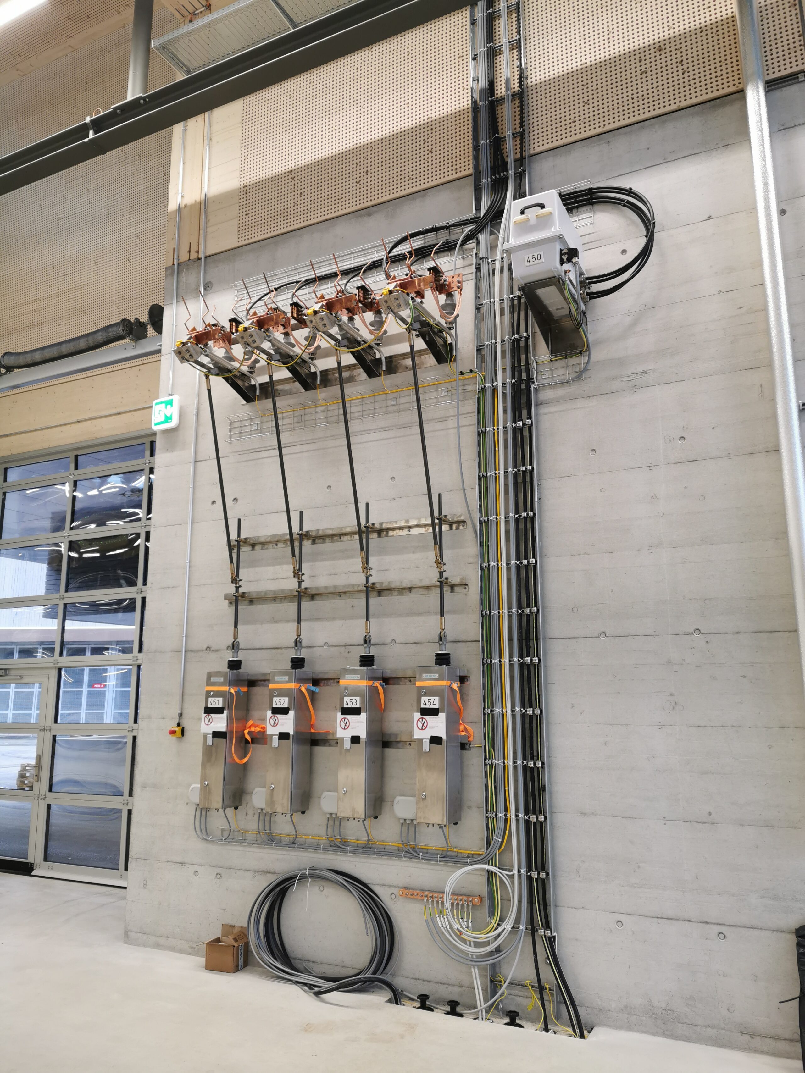 - Die Fahrleitung im Verkehrsgebäude soll als Einfachfahrleitung ausgeführt werden. Über einen vorgelagerten Leistungsschalter und den nachfolgenden gleisspezifischen Fahrleitungsschalter sollen die vier Gleise einzeln geschaltet bzw. geerdet werden können.