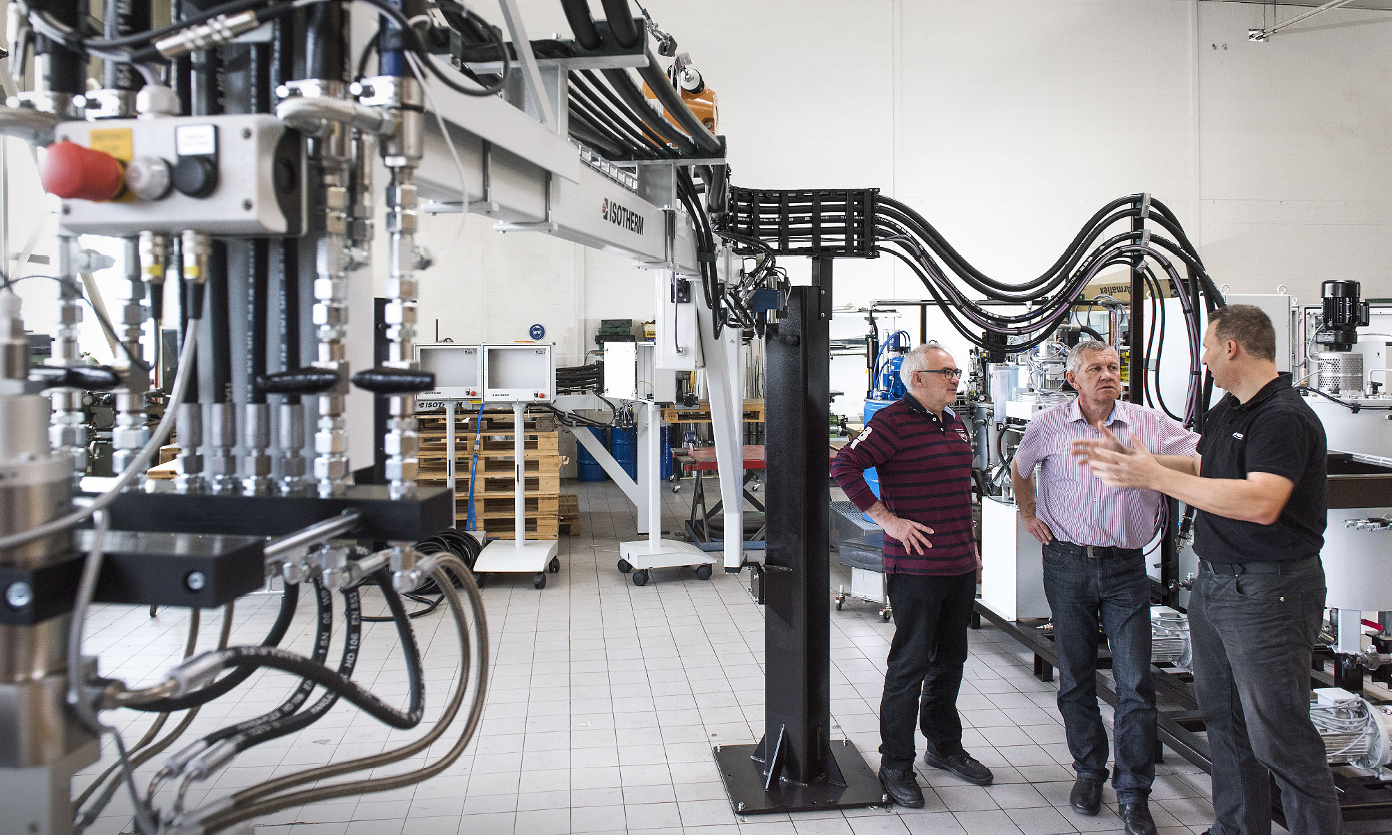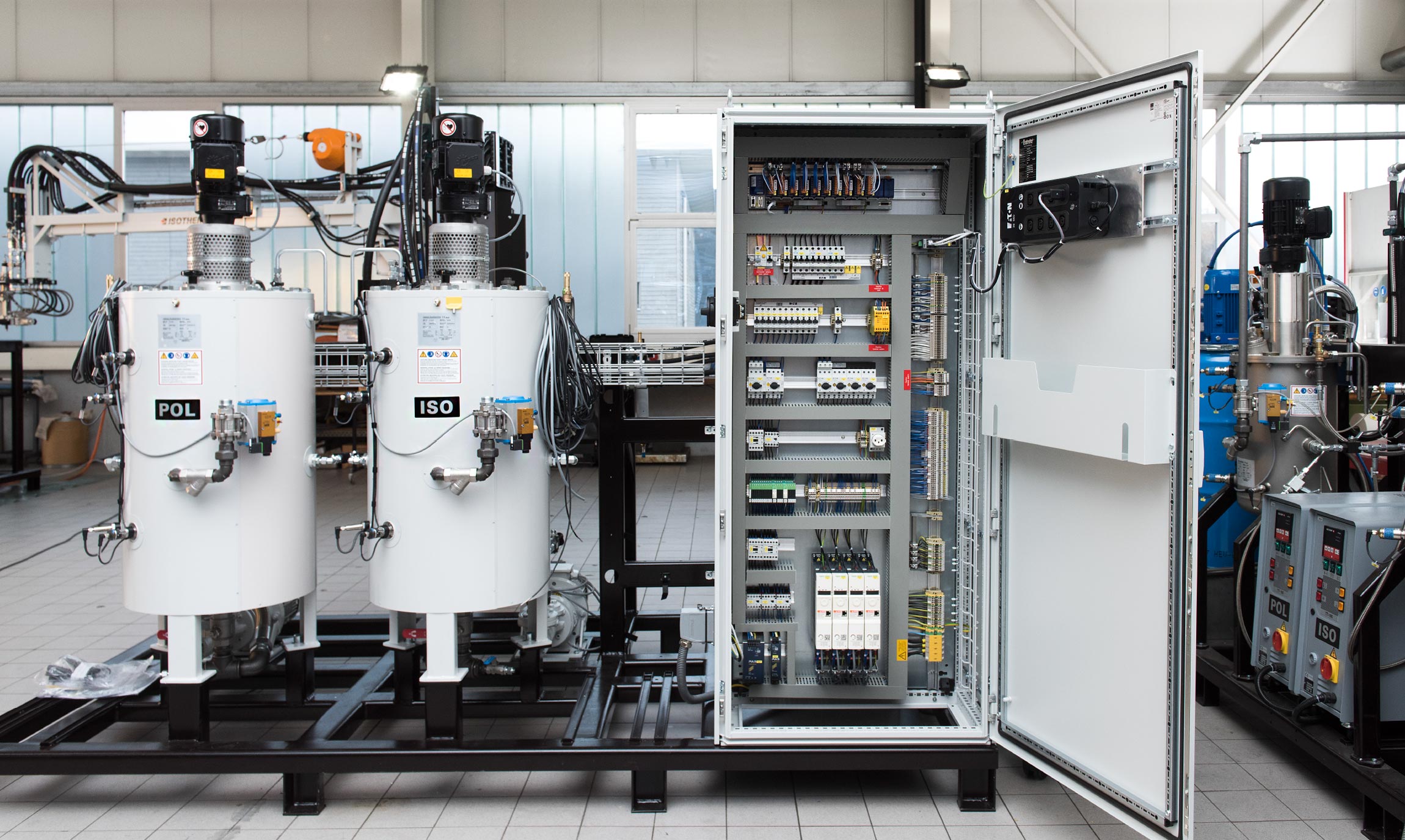 Die Firma Isotherm AG in Uetendorf ist seit 1974 spezialisiert auf die Planung und den Bau von Produktionsanlagen für die Polyurethanverarbeitung. Die dokumentierte Anlage PSM 90 kommt für die Verfahrenstechnik «Giessen/Injizieren» zum Einsatz. Unter dem Begriff Kabelumguss werden Kabel und Stecker im geschlossenen Werkzeug zur Erhöhung der Formhaltigkeit und zum Schutz gegen Spritzwasser ummantelt. Kabeltüllen werden luft- und wasserdicht vergossen. Die Dosieraggregate mit Verdrängerkolbentechnik erlauben das Giessen von Elastomeren und Polyurea. Die lösungs- und spülmittelfreien Mischköpfe arbeiten umweltfreundlich nach dem Prinzip der Gegenstromvermischung und sind automatisch mechanisch selbstreinigend.